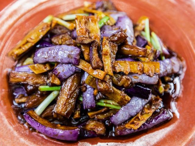 4、倒入適量清水,大火煮開後放入炸好的茄子條,翻炒均勻,讓茄子充分吸收湯汁,燉煮2 - 3分鐘,根據個人口味加入適量鹽調味,大火收汁後即可出鍋。