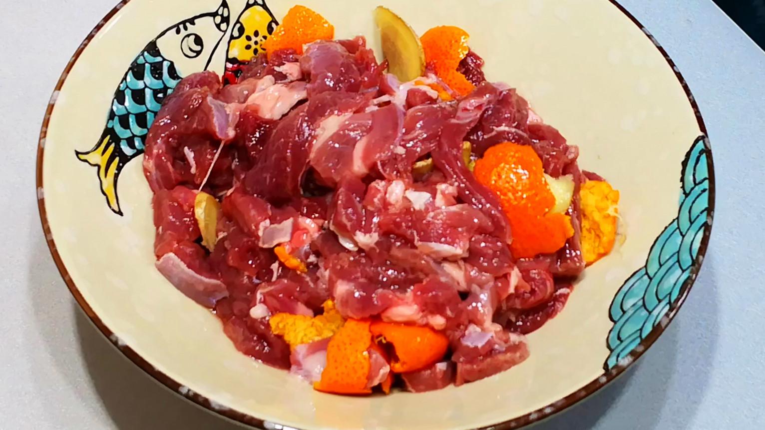 2、醃製好的羊肉挑出薑片和桔子皮,進行二次醃製:加入一匙鹽、一匙糖、適量的胡椒粉、生抽、蠔油,一勺澱粉、一個蛋清,抓拌至料汁完全被吸收後再滴入幾滴食用油,鎖住羊肉的營養和水分,再次抓勻後醃製10分鐘即可。