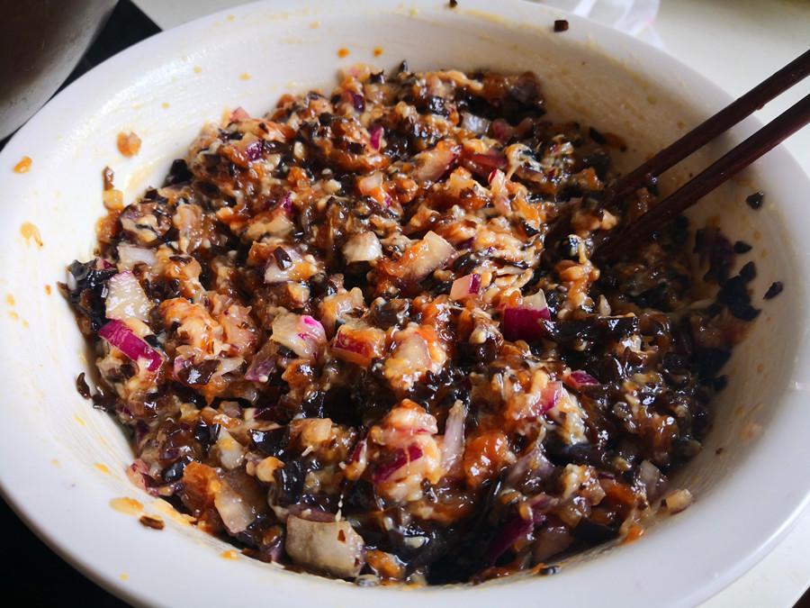 3.然後,把切好的洋蔥丁、木耳碎全都放到醃製入味的肉餡中,加入兩勺熟油攪拌均勻,鎖住洋蔥的鮮味和水分後,再根據自己的口味加入適量的食鹽,然後用筷子順時針多攪拌一會兒,攪拌至餡料上勁,感覺有一定的黏性和阻力後即可,這樣調好的餡料成餡不散。