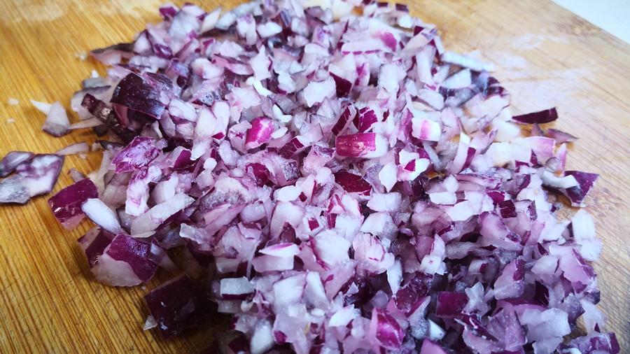 洋蔥一個剝掉外皮後切成洋蔥丁。洋蔥在切的過程中,會刺激眼睛流淚,可以把刀蘸點水再切,可以減輕刺激。