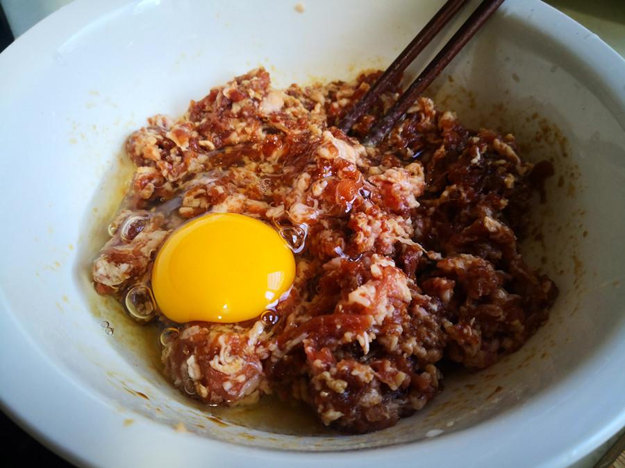 剁好的羊肉餡放入大碗中,加入適量的蔥薑蒜末,再加入適量的胡椒粉、蠔油、生抽和少許香油,順着一個方向攪拌均勻後,再打入一個雞蛋,然後繼續用筷子多攪拌一會兒,徹底攪拌均勻後,讓肉餡充分吸收調料的味道後,放一邊醃製20分鐘入味。