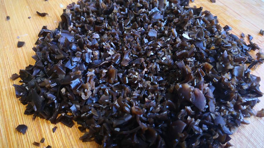 2.接着取一把黑木耳用溫水泡軟後,再下鍋焯燙一分鐘,然後控水撈出切碎剁細備用;