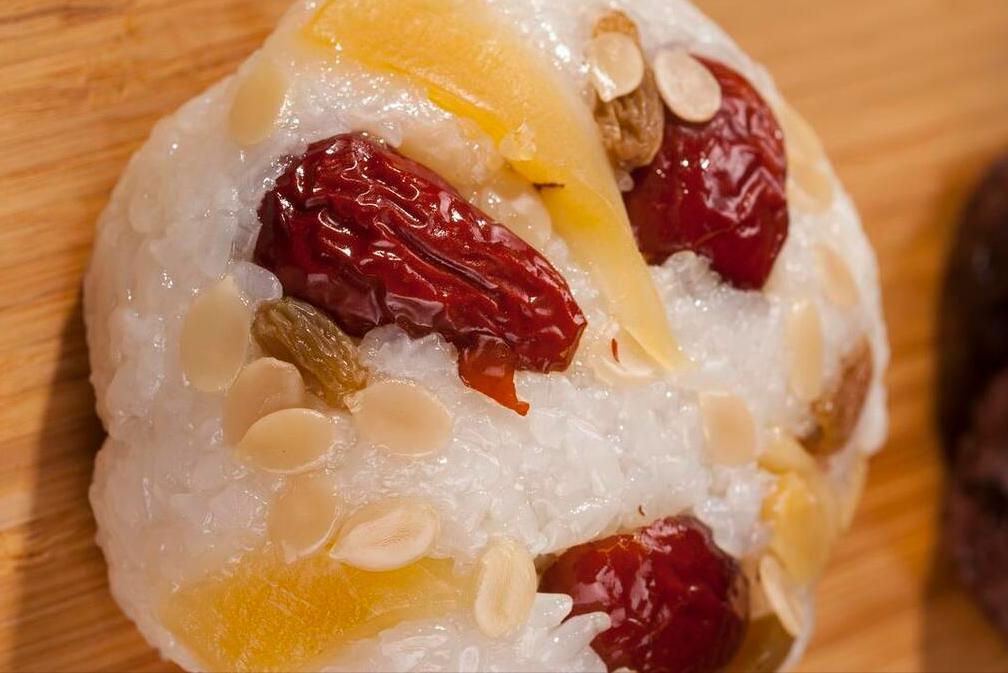 食材:糯米300g、豬油1勺、白糖適量、紅棗、葡萄乾、花生等果乾、豆沙餡