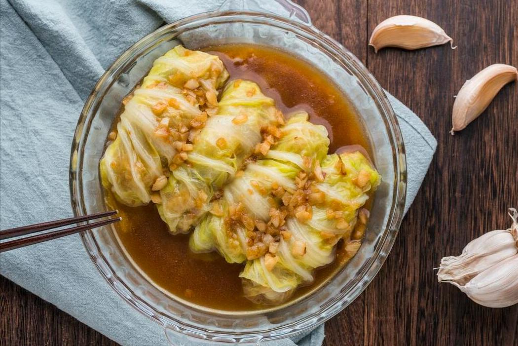 2、白菜葉子選嫩一點的,燒一鍋開水下進去焯水,然後撈出來,接着往裏面裹上肉餡,捲起來均勻擺在盤子裏,放入鍋中蒸上15分鐘左右,直至徹底蒸熟。蒸出來的水,倒在鍋子裏,然後來點鹽、味精、生抽調味,接着澆上少許水澱粉勾芡,把湯汁澆在白菜肉卷中,即可開喫。