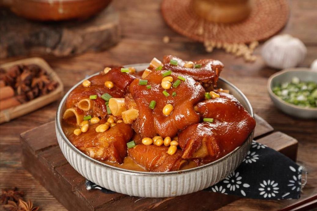 食材:豬蹄、黃豆、蔥姜、八角、鹽、味精、生抽、老抽、蠔油、料酒、食用油