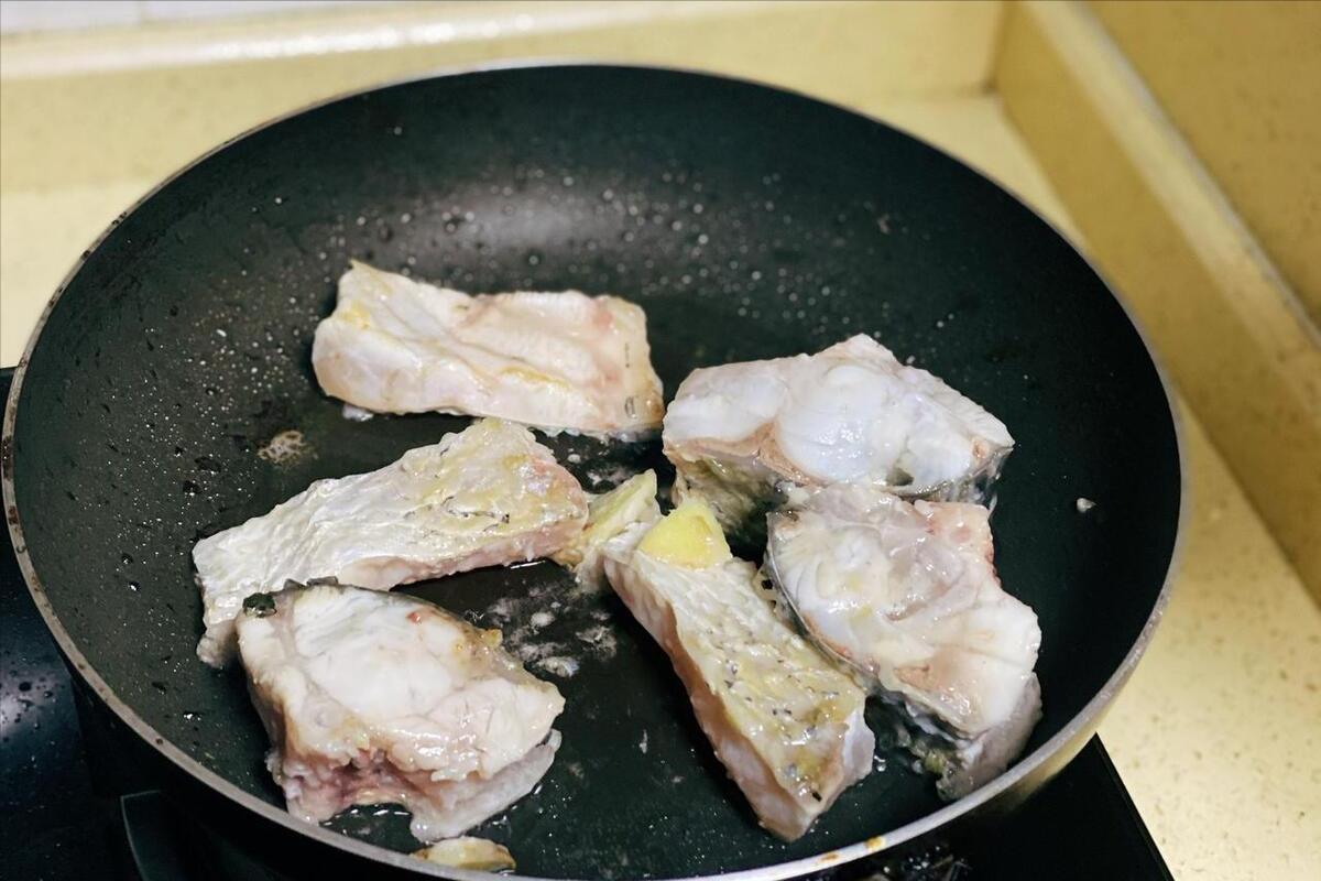 2、等魚塊醃製好,在表面裹上澱粉,接下來,往鍋中倒油,燒熱下入魚塊開始煎,煎到表面金黃之後,加上蔥薑蒜爆香,然後來上1勺豆瓣醬炒香,再來點鹽、白胡椒粉、雞精調味,添上開水開始燉,燉上半個小時左右,出鍋開喫。