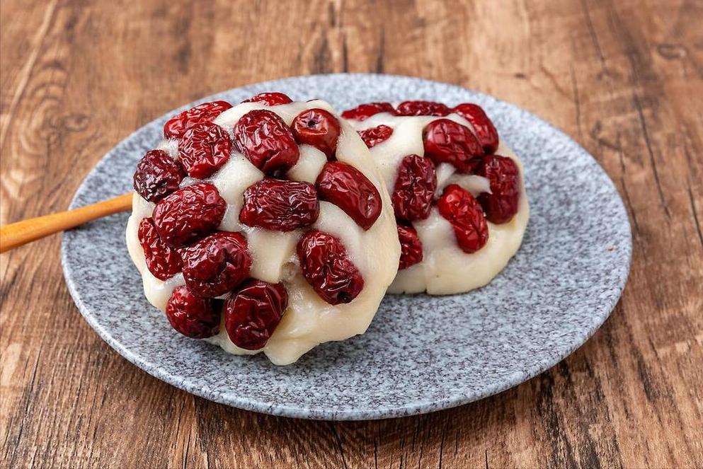 糯米麪倒在小盆裏,之後往裏面加水,倒入適量的清水之後,我們開始不停的攪拌,直至攪拌成絮狀,然後團成麪糰。把麪糰分成劑子,每一個劑子都拿起來整理成年糕,再在上面點綴上大棗,之後放在鍋子裏蒸,蒸熟後即可開喫,糯嘰嘰。
