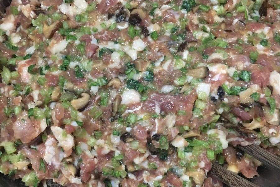 食材:芹菜、豬肉、蔥姜、花椒水、鹽、雞精、十三香、生抽、蠔油、香油