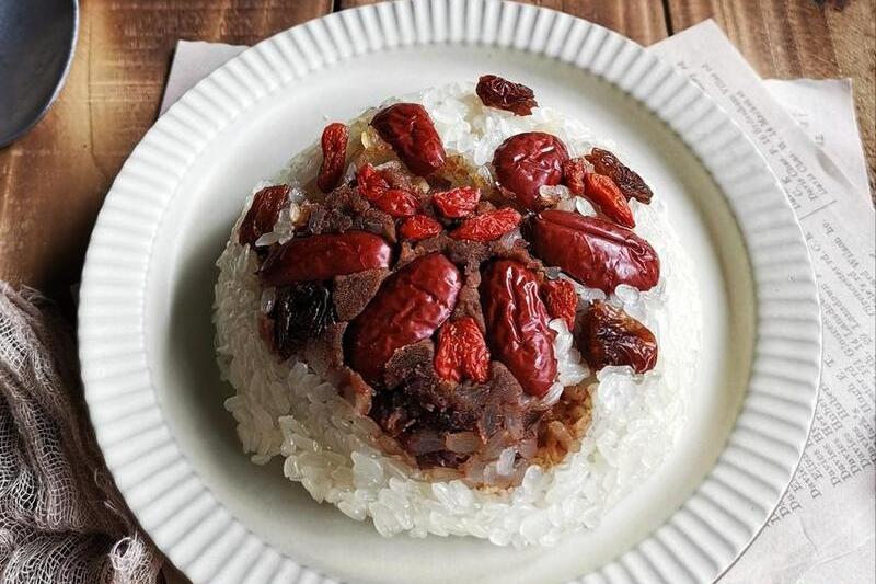 食材:糯米150g、紅棗適量、豬油3g、紅豆沙適量、葡萄乾等配料
