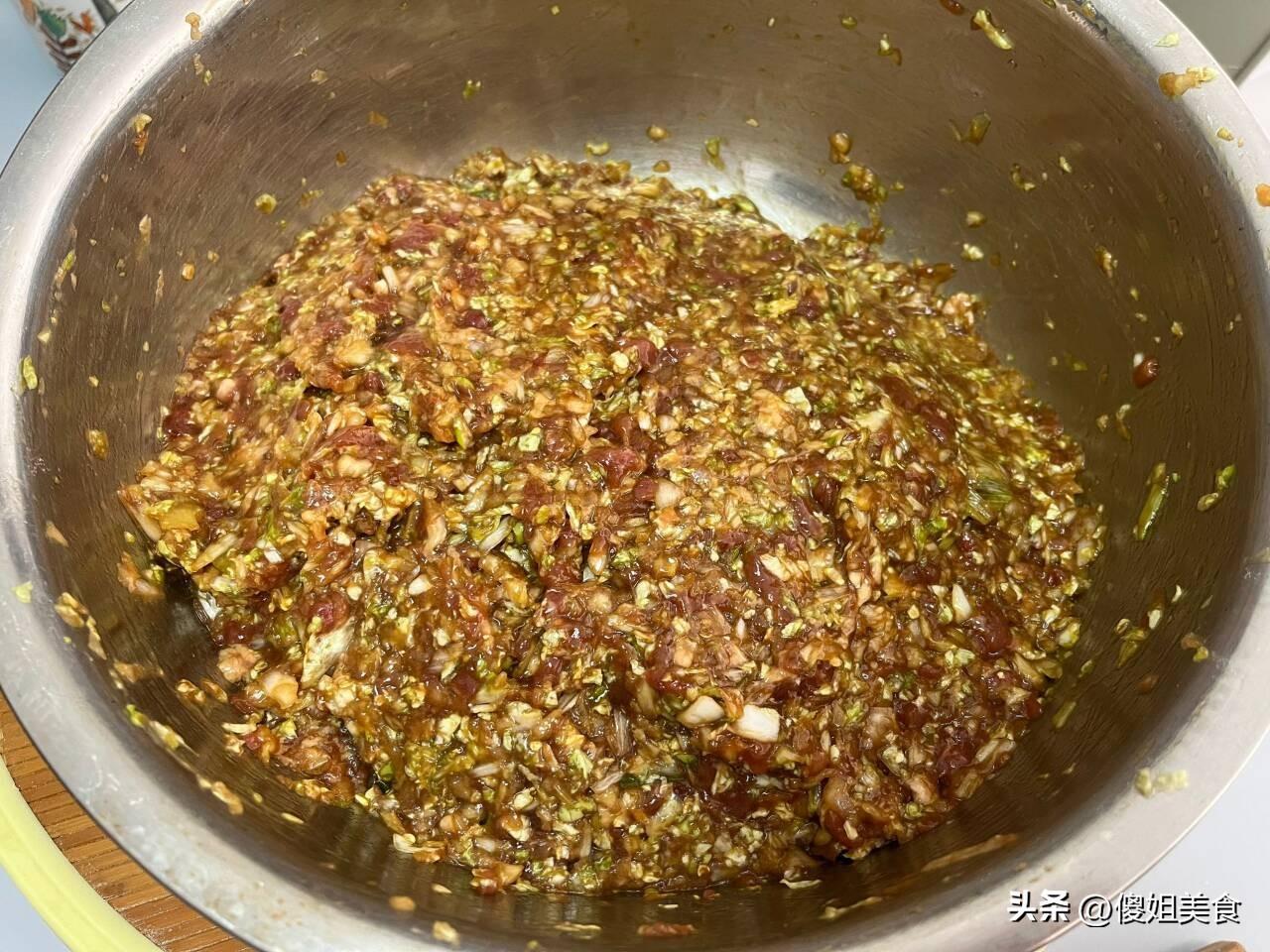 1、把新鮮的大白菜清洗乾淨後切成小塊,再改刀剁碎,白菜也不要太碎了,不然影響口感。白菜中的水分比較大,剁白菜的時候往上面撒上1-2勺食鹽,把裏面的水分殺出來,最後把剁好的白菜放入一個乾淨的屜布內擠幹水分。