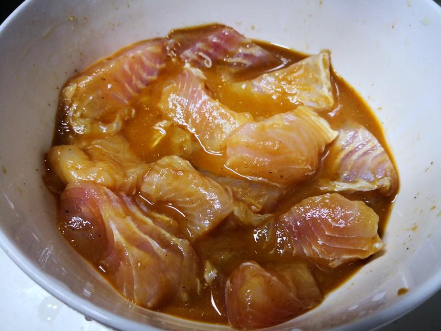 1.先準備一塊新鮮的龍利魚肉,將其清洗乾淨後控乾淨水分,然後分成大小均等的小段後放入大碗中。接着均勻地撒上適量的食鹽、料酒、生抽、花椒粉、胡椒粉、一勺澱粉和少許老抽,下手抓拌一會兒,讓魚肉充分吸收料汁入味,然後放一邊醃製15~20分鐘,給魚肉去腥味、增底味。