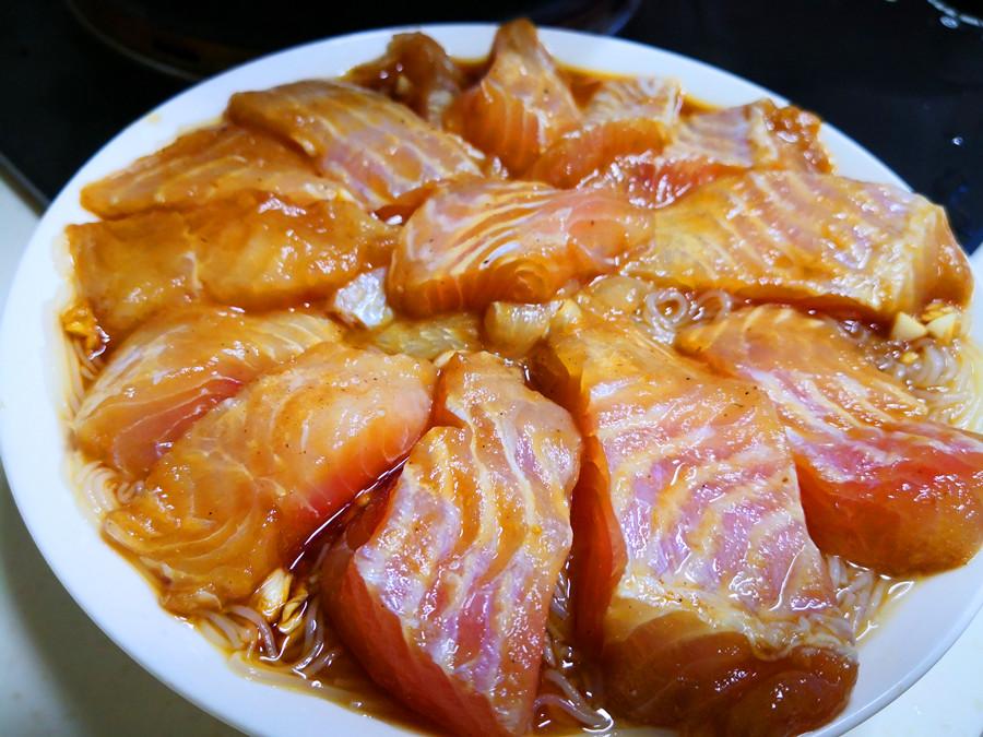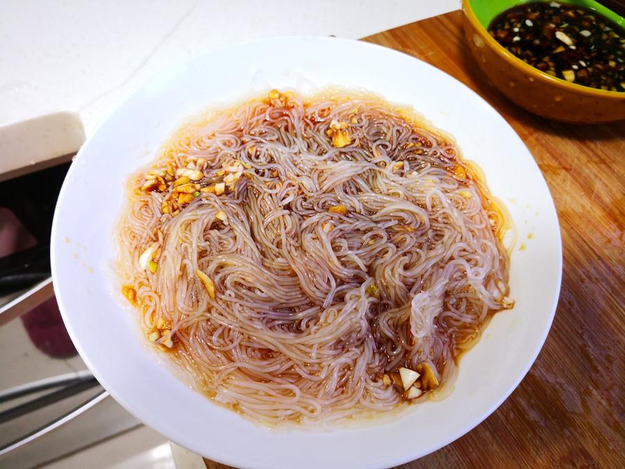 3.粉絲泡軟後取出,用剪刀將其剪成短一點的段後鋪到盤子的底部,然後倒入一半剛剛調好的料汁,攪拌一下,讓粉絲均勻吸收料汁後,再把醃製入味的龍利魚肉擺入盤中,擺好後再把另一半的料汁均勻地淋在龍利魚肉上。