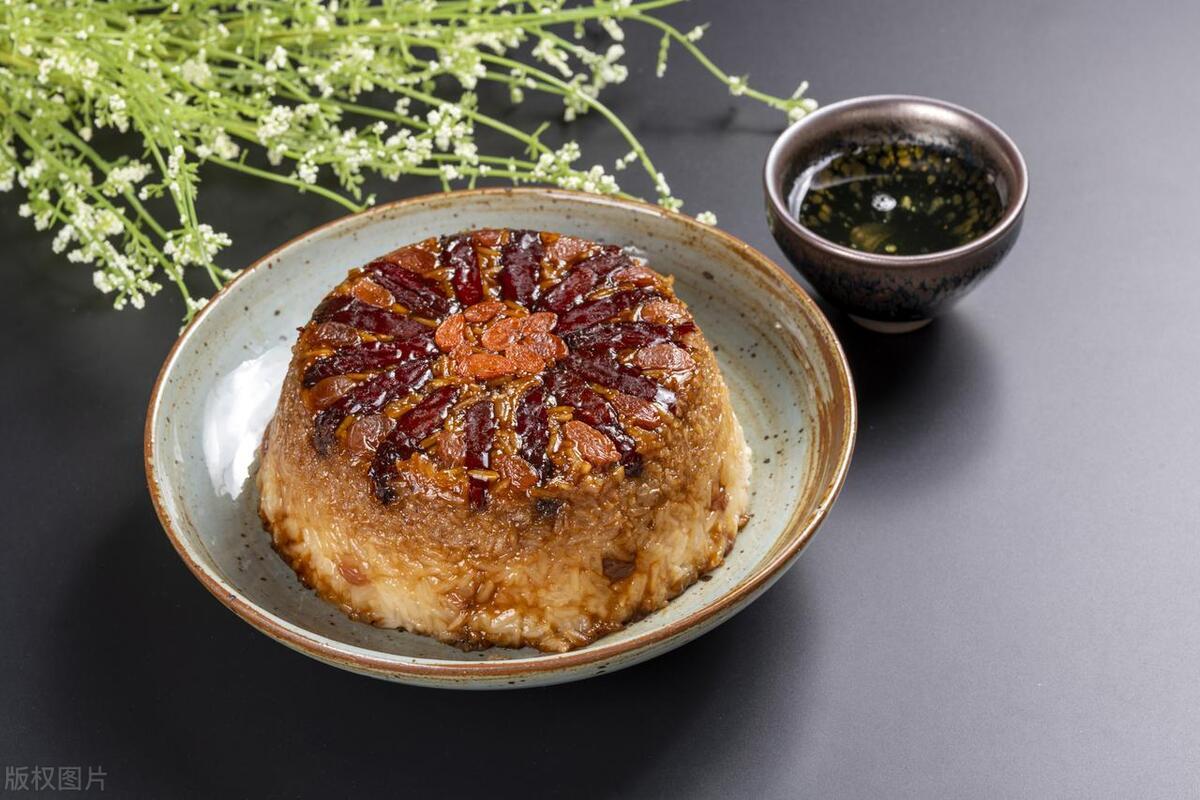 食材:糯米 300 克、紅棗 10 顆、葡萄乾 50 克、蓮子 50 克、桂圓乾 50 克、紅豆沙 150 克、白砂糖 50 克、豬油或玉米油 30 克。