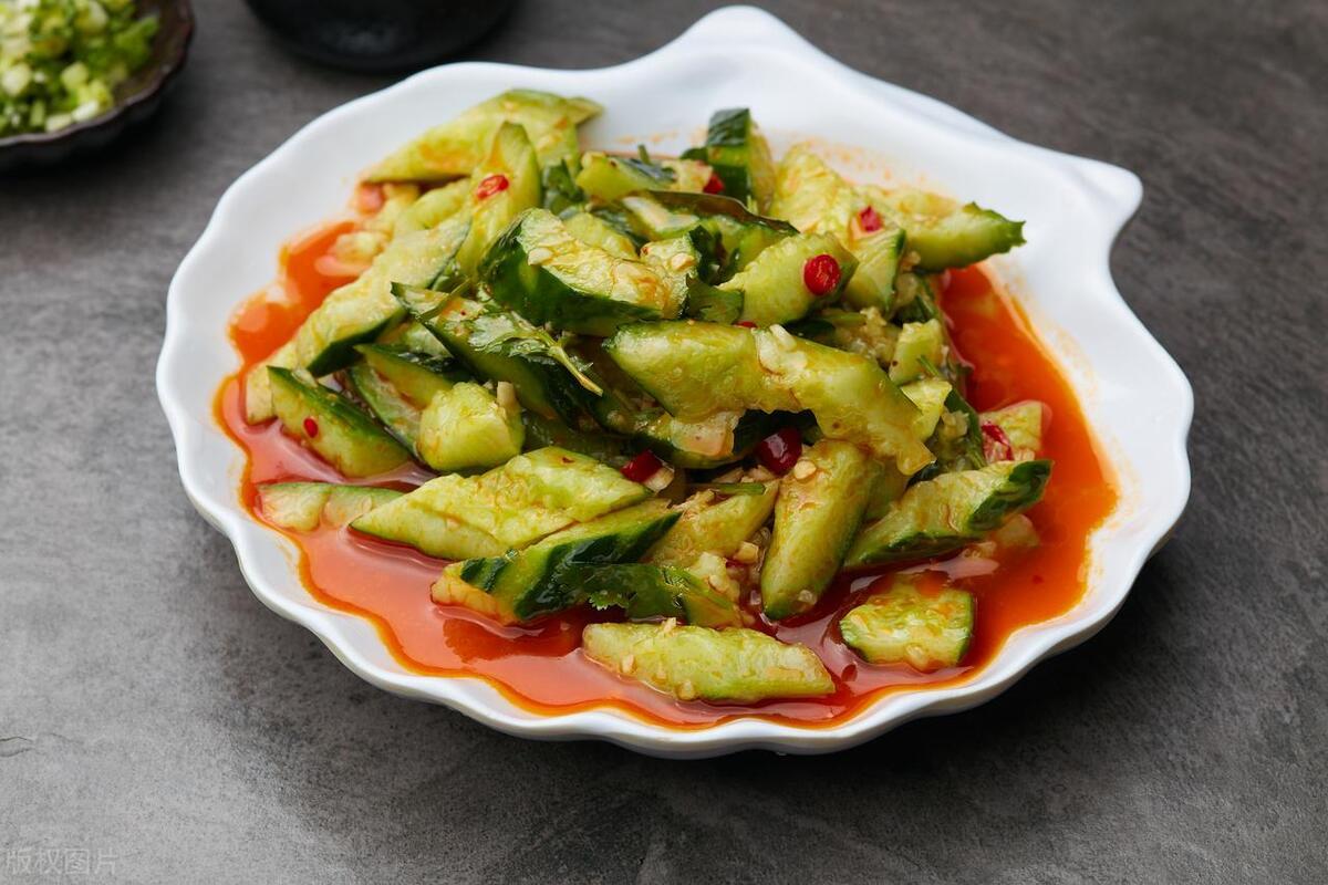 食材:黃瓜 2 根、蒜 3 瓣、生抽 2 勺、醋 2 勺、鹽 1 小勺、白糖 1 小勺、香油 1 勺、辣椒油 1 勺、熟芝麻適量。