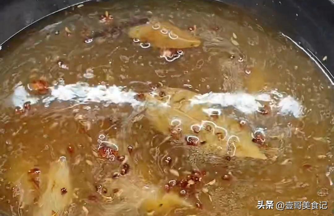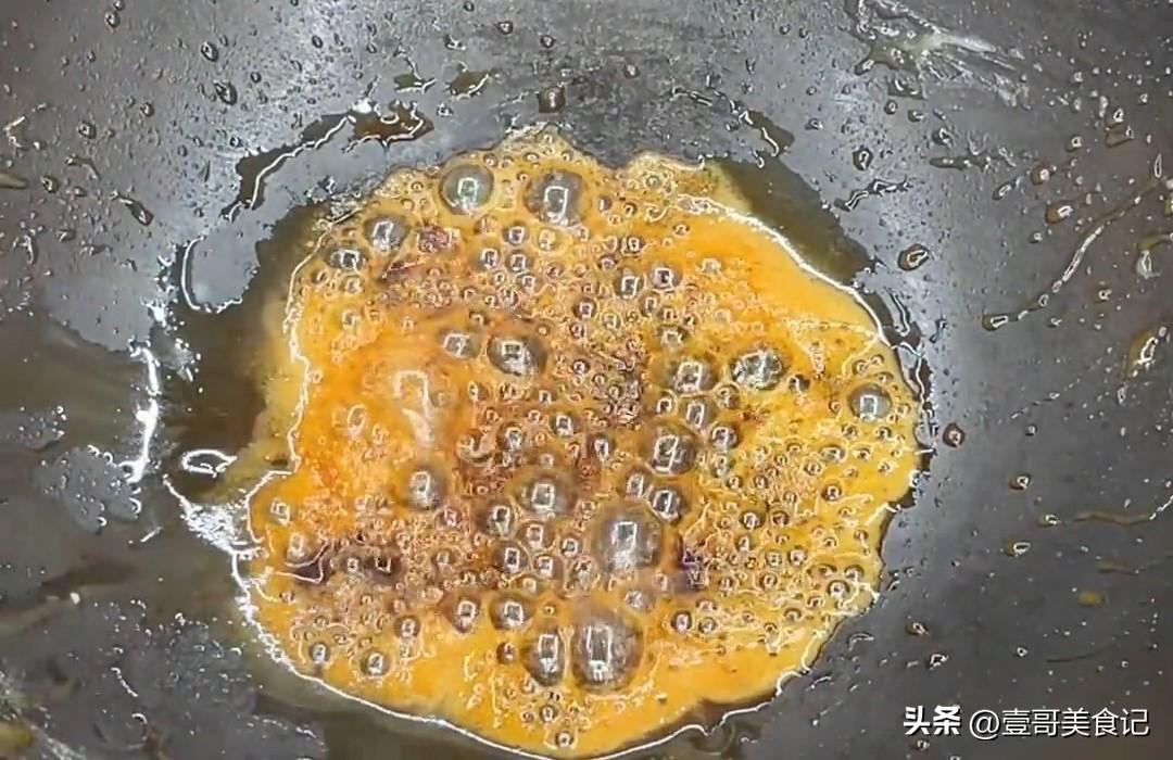 最後這個糖熬到沒有泡沫的時候,咱們一定要把火給開到最小,當這個糖完全沒有泡沫的時候就是成功的糖色了。這個時候往鍋裏面倒入開水進去,這樣糖色就熬好了,這樣出來的糖色顏色紅亮還不苦。