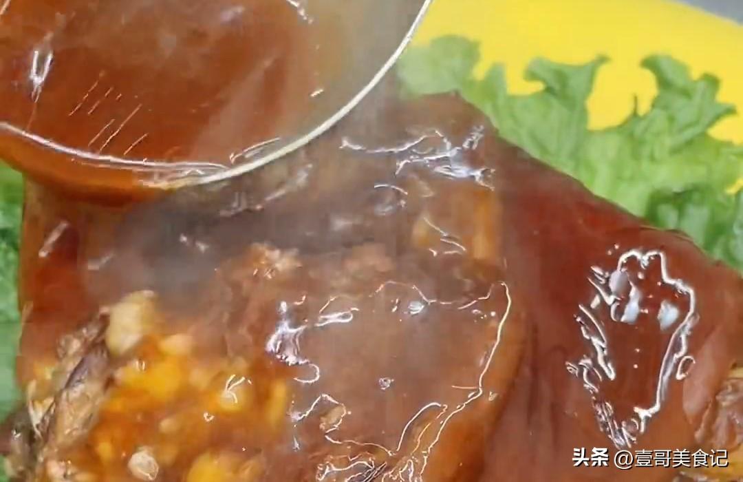 出鍋之後把煮肘子的湯給它過濾一下,把渣渣過濾出來,把肘子給它大火收個汁。湯汁收到一半的時候淋入水澱粉進去勾芡一下,最後再淋點油進去,讓湯汁顏色更亮一些。最後料汁淋上肘子上面就可以了,這樣做的肘子軟爛入味超級好喫。