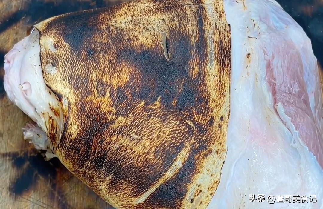 做紅燒肘子的第一步就是給肘子去腥,這一步非常的關鍵,做的好了,燒出來的肘子喫起來格外香。年夜飯的時候這樣做,家人都對你豎起大拇指。準備一個兩斤半左右的大肘子,用火燙一下,去除雜毛的同時也給它去個腥。