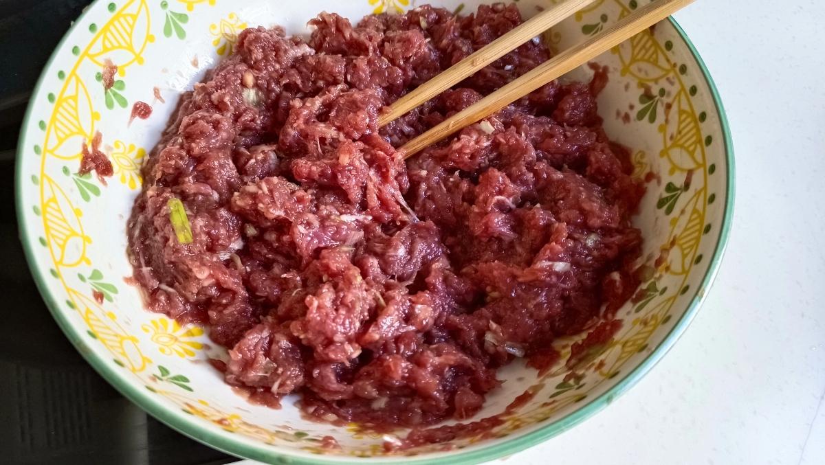 2.準備一塊肥瘦相間的豬肉,這樣的豬肉鮮嫩又多汁,剁成細膩的肉餡後放入大碗中,然後加入適量的蔥薑末,再磕入一個雞蛋,加入適量的食鹽、生抽、料酒、胡椒粉、雞精、蠔油、花椒粉和少許香油,用筷子順着一個方向充分攪拌均勻,然後放一邊醃製20分鐘左右,讓餡料吸收調料後入味。