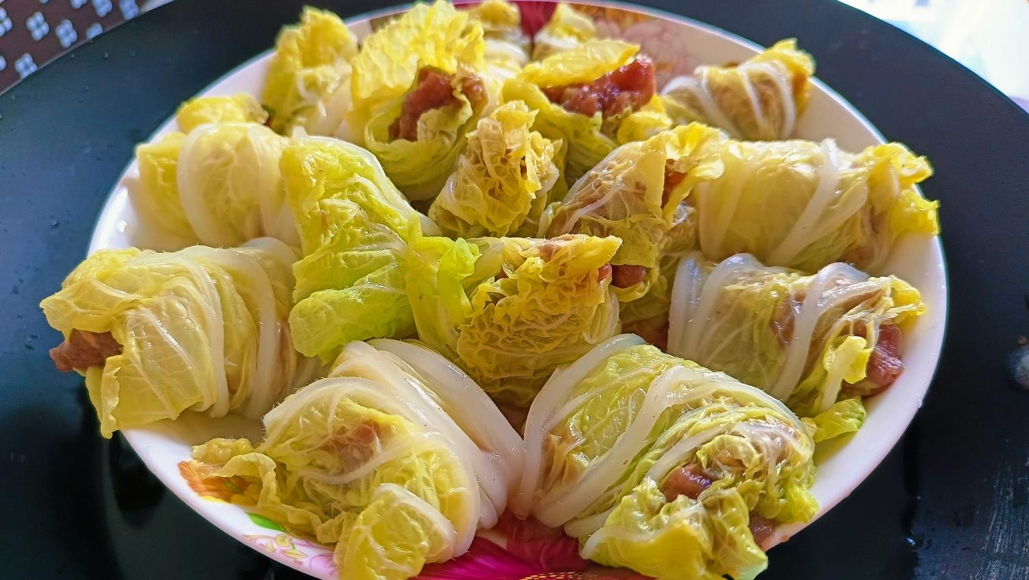 3.二十分鐘後,取出白菜葉子平鋪到案板上,然後再把醃製入味的肉餡均勻地鋪到白菜葉子上,再將白菜葉子從一端慢慢捲起來,卷好後如果白菜卷太大,可以用刀從中間切開,然後再將其擺放入盤中。