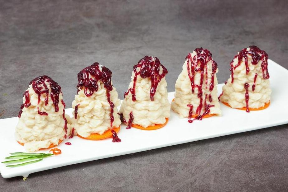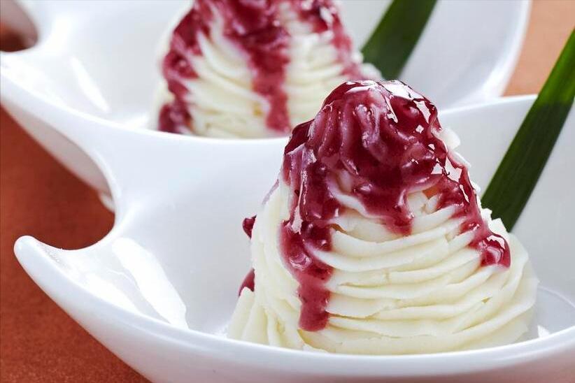 山藥的外皮削掉以後,放在水中清洗幾遍,之後放入鍋中開始蒸,蒸到軟爛以後就可以出鍋了。將山藥放在碗中壓成泥,然後用裱花袋裱一個漂亮的形狀,之後準備藍莓醬,用清水攪拌一下,澆在山藥泥上,就可以喫啦。