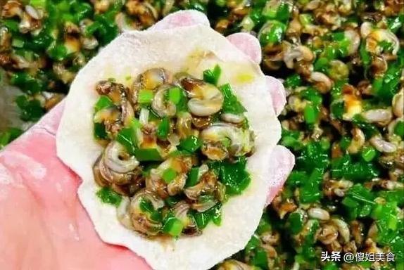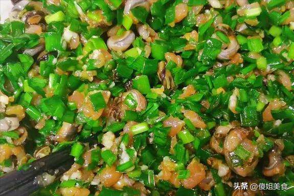 2、將螺肉洗淨,稍微切一下,豬肉剁成肉餡,加調味品醃製20分鐘。將韭菜、肉餡和螺肉混合,攪拌均勻。
