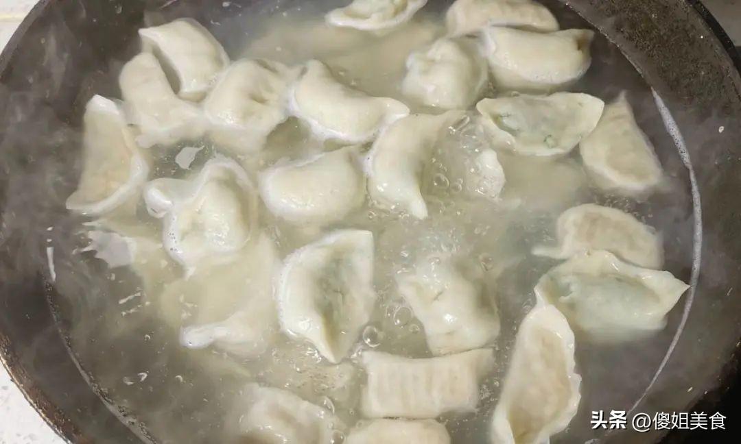 3、大火煮沸一鍋水,放入餃子,等餃子浮起來,再煮3-5分鐘,即可撈出。