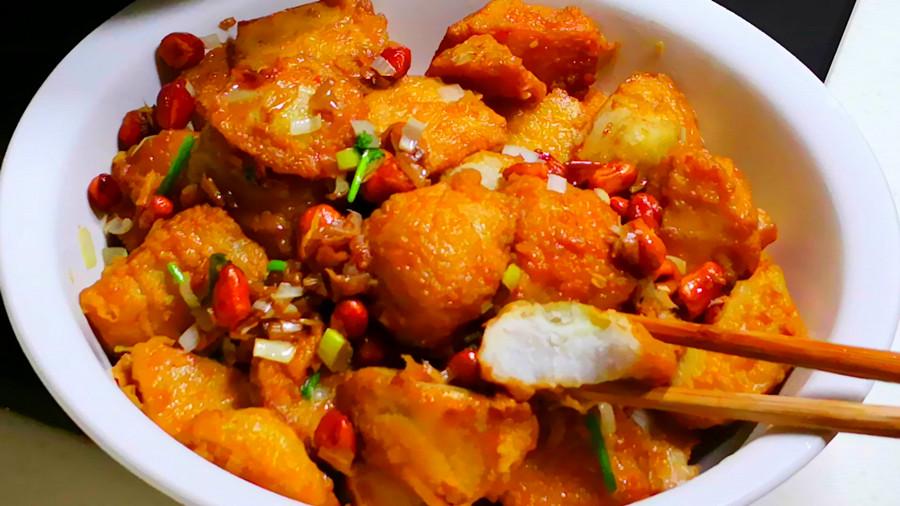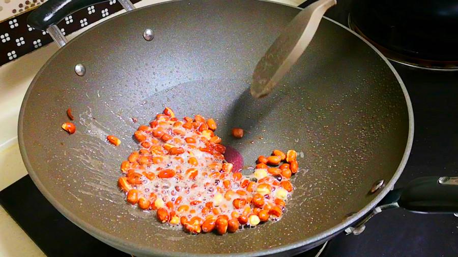 3.接着我們再來炒個花生米:先將花生米沖洗乾淨後晾乾水分,然後熱鍋加入少許涼油,倒入花生米,中小火慢慢翻炒,這個過程要用鏟子不停地翻拌,防止花生米糊鍋,隨着停地翻炒,花生米便會發出“噼裏啪啦”的響聲,這時再繼續翻炒,炒至沒有響聲後關火,然後沿着鍋邊滴入幾滴白酒,再繼續翻炒一會兒後出鍋裝盤備用,用這個方法炒的花生米又香又酥又脆。