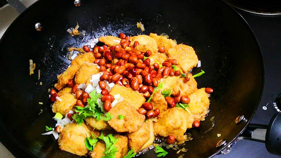 6.大約燉五六分鐘後開鍋,翻炒一下,讓芋頭入味均勻,收至湯汁變濃後再倒入之前炒好的花生米,繼續翻炒片刻後撒上一把香菜段,翻炒均勻後關火出鍋,美味即成!