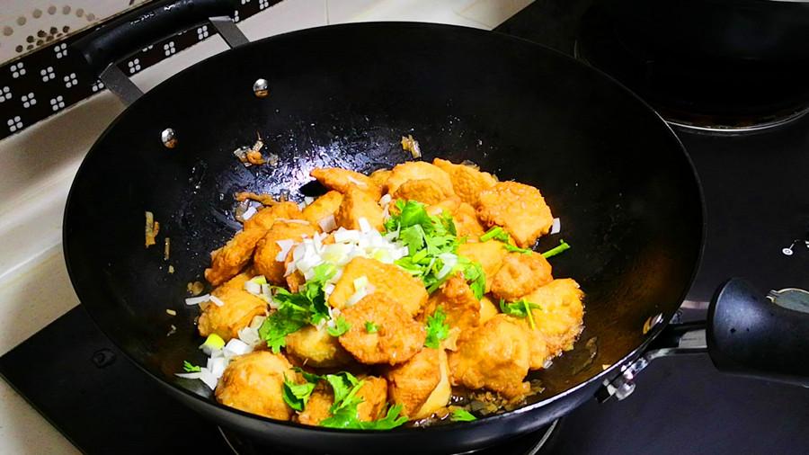 5.鍋留底油,燒熱後下入薑末和蔥花炒香,然後加入適量的食鹽、白糖、蠔油、生抽和半碗清水,再倒入炸好的芋頭,蓋好鍋蓋燉煮片刻。