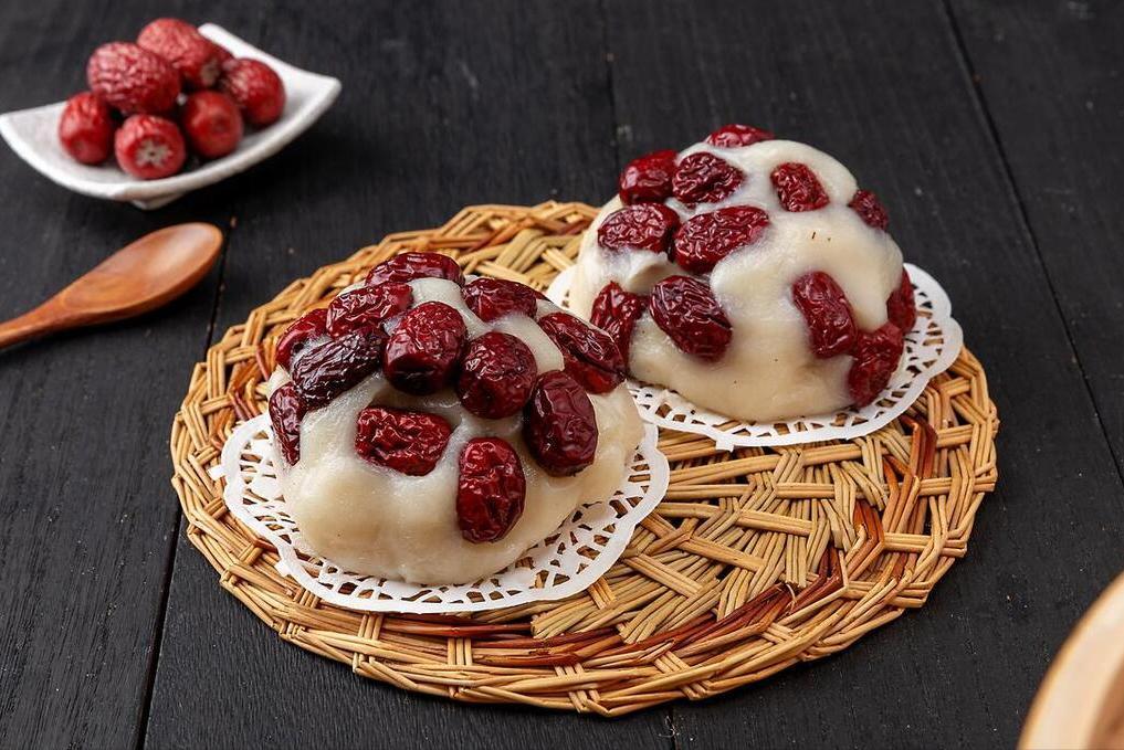 糯米粉中加上清水,開始用筷子不停的攪拌,將其攪拌成絮狀以後,下手揉成麪糰,再把麪糰分成數個劑子,每一個劑子都整理一下,做成年糕的形狀,然後準備好紅棗,把紅棗裝飾在年糕上,隨後上鍋去蒸,蒸上20分鐘出鍋開喫。