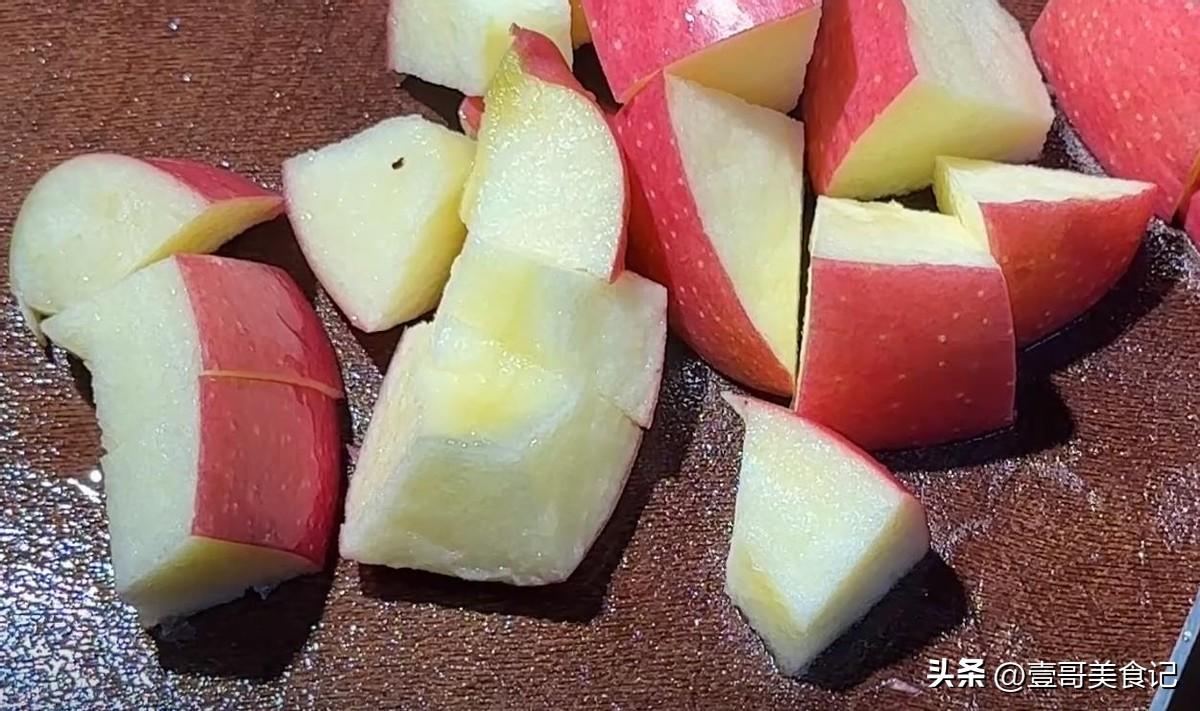 第二步,準備一個新鮮的蘋果,把它清洗乾淨之後,消掉蘋果蒂和蘋果核,再把它切成小塊的也放在碗中備用。有的人可能會把蘋果皮削掉,再切成小塊的,但是實際上蘋果皮也含有豐富的營養,所以,建議大家不要去果皮。