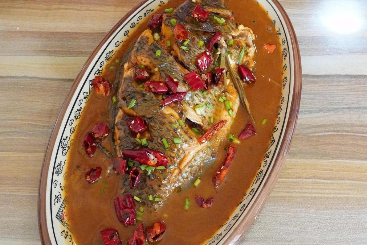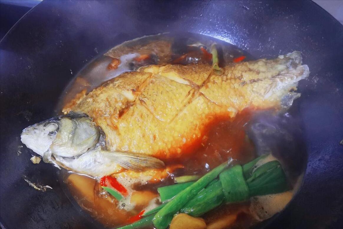 4、在燉的過程中,要時不時的將湯汁澆在魚的身上,這樣可以更入味,15分鐘左右的時間,鍋子裏的湯汁就逐漸變少了,再開大火把多餘的湯汁收一收,收到湯汁濃郁以後,往鍋子裏撒上剛纔切好的香菜和小米椒,就可以出鍋啦。