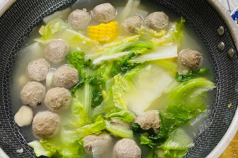 6、保持小火煮3分鐘左右,就差不多定型了,然後我們再轉爲小火繼續煮一會兒,直至徹底煮沸,丸子就熟透了,這個時候往裏面來點小青菜,再加上少許鹽、白胡椒粉調味,即可出鍋開喫!