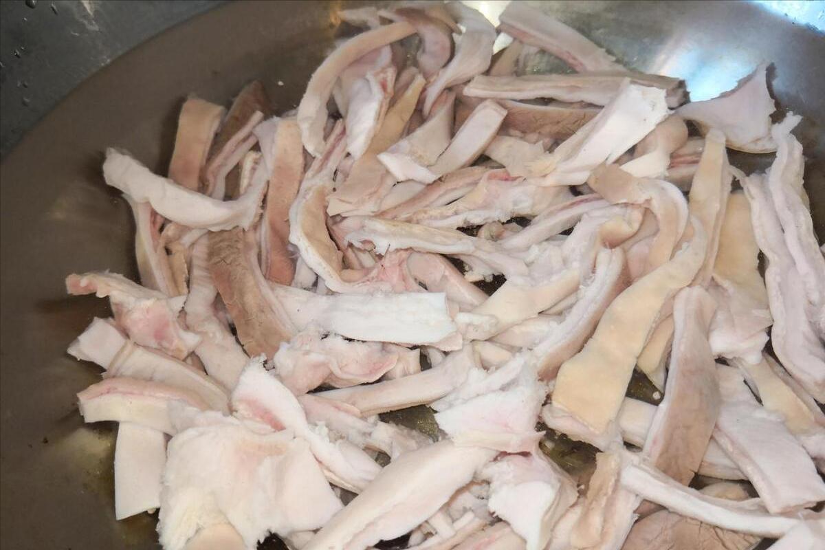 3、隨後準備好鍋子,往裏面倒入適量的清水,把豬肚下進去,來點料酒開始焯水,等焯水之後把豬肚取出來,切成肚絲。蔥姜、洋蔥、青紅辣椒這些配料也都切好,接下來把鍋子燒熱,然後往裏面倒上適量的食用油,熱鍋涼油將蔥姜爆香。