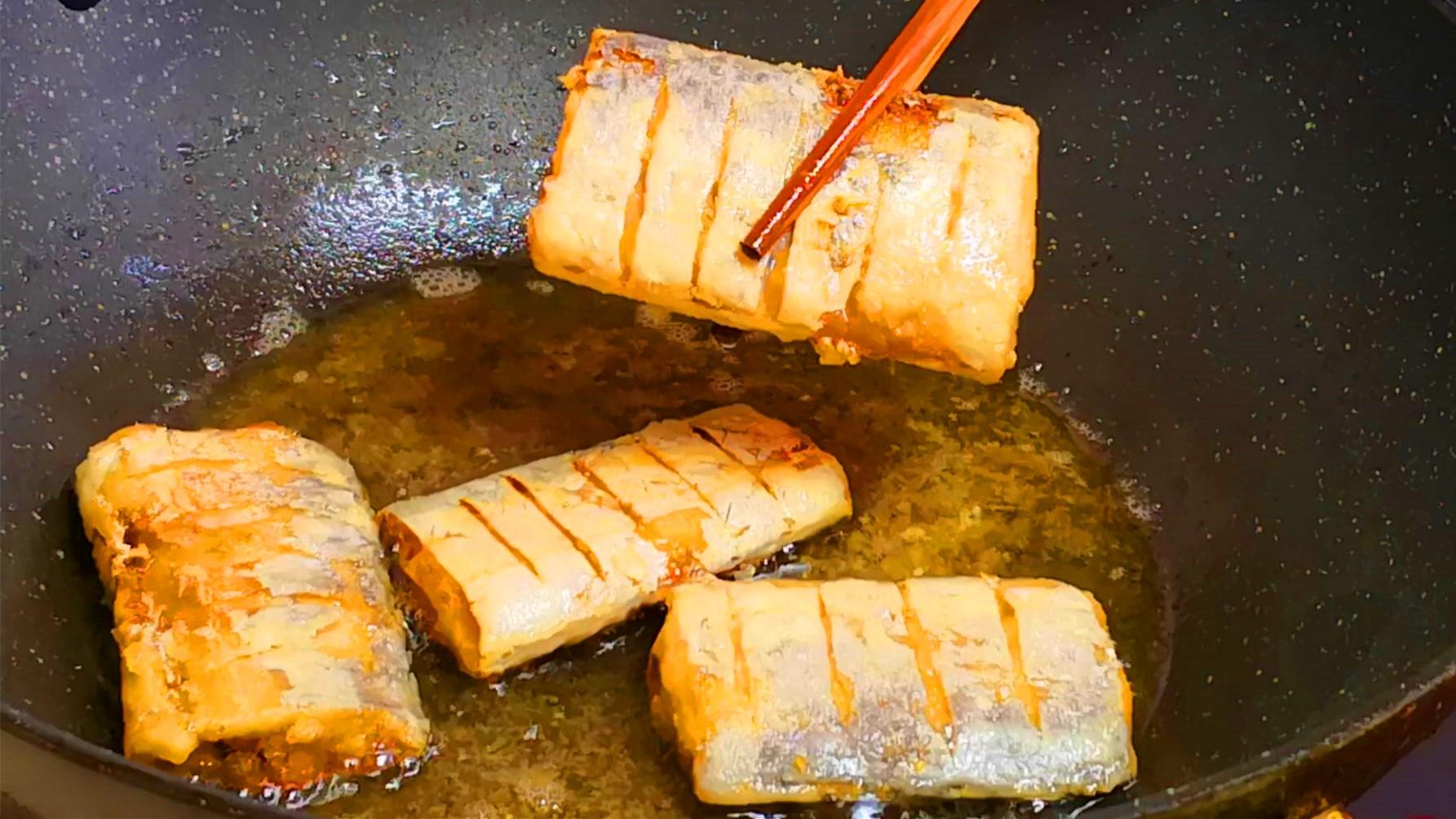 4.起鍋加入適量的油,燒至油溫6成熱時下入帶魚段,一面煎黃後再翻到另一面煎,煎至兩面都呈金黃色時關火,控油撈出帶魚段裝盤備用。這時帶魚肉外面已經金黃酥脆,裏面的肉卻還是嫩嫩的。