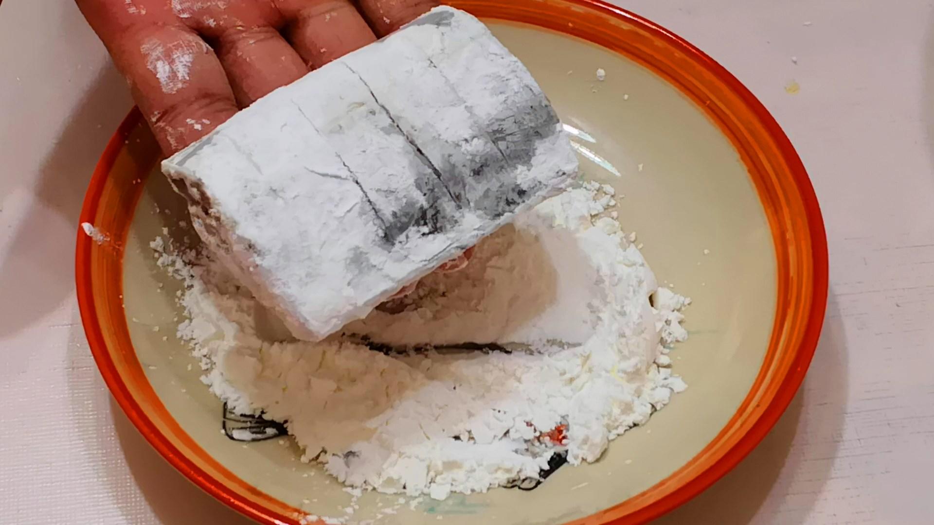 3.這時帶魚也已經醃製入味了,將醃製好的帶魚段取出放到裝有澱粉的盤中,讓帶魚段表面均勻地裹上一層薄薄的澱粉。