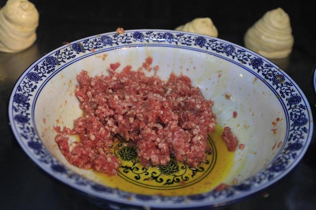 2、接下來,需要往牛肉餡中倒入花椒水,這個主要是去腥用的,倒進去以後不停攪打,打水上勁後的牛肉餡,會變得非常多汁。接下來,再往牛肉餡中來點蔥薑末,然後用鹽、五香粉、雞精、生抽、香油來調味。