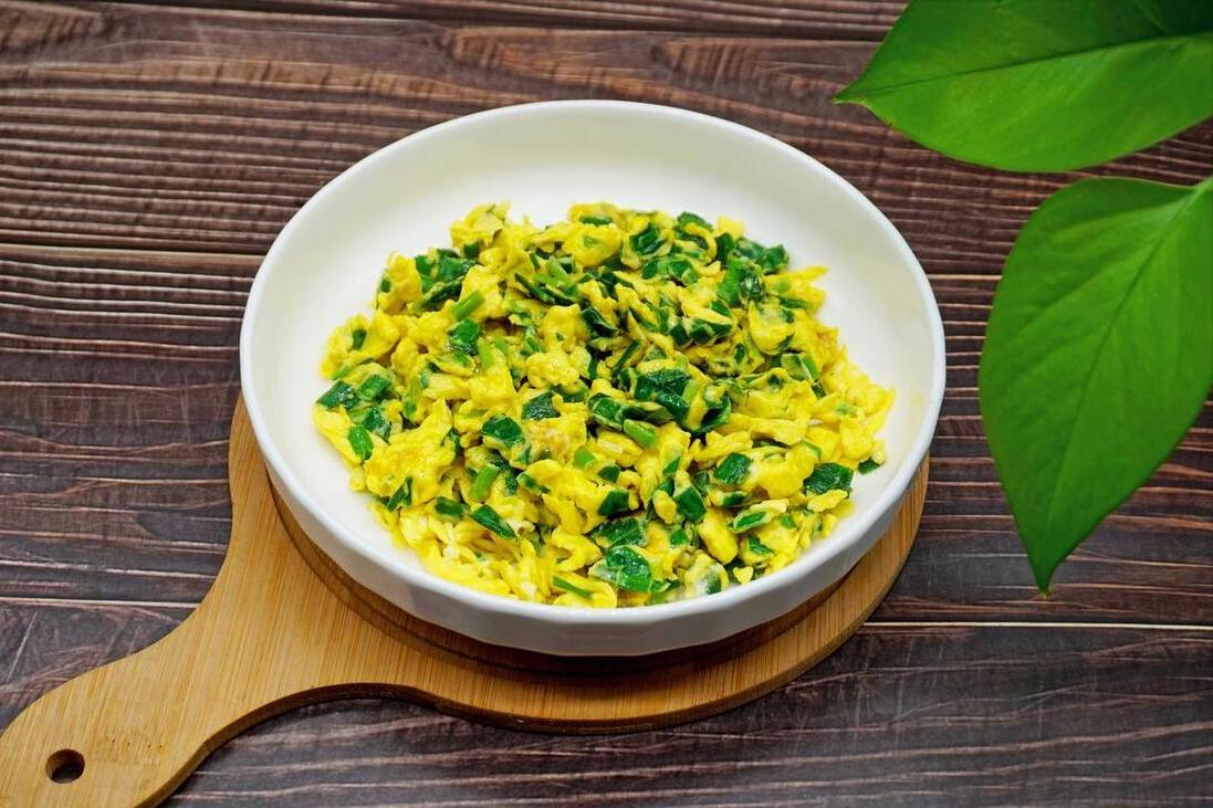 2、接下來,往碗中打入幾個雞蛋,把雞蛋攪散之後,接着將韭菜也倒進去,隨後來點鹽調味,充分攪拌均勻。接下來起油鍋,燒熱之後將韭菜蛋液倒進去,剛倒進去的時候不要着急翻動,等到微微定型後開始翻炒,炒成小塊出鍋。