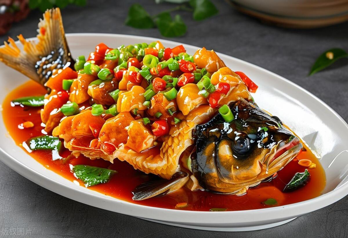 - 把煎好的鯉魚放入鍋中,小火燉煮 10 - 15 分鐘,期間不斷將湯汁澆在魚身上,讓魚更入味。最後大火收汁,湯汁濃稠後,將魚盛出裝盤,撒上蔥花即可。