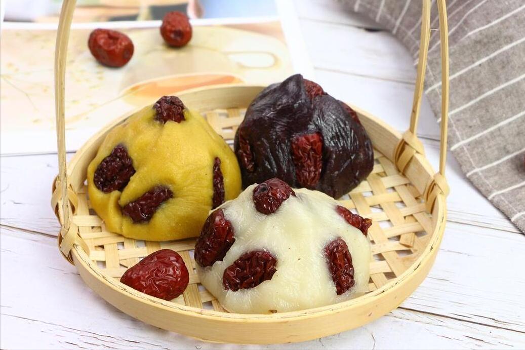 準備適量的糯米粉,往裏面倒上清水開始不停攪拌,攪拌均勻後開始揉麪,揉成麪糰後分成數個劑子,每一個劑子都揉成年糕的形狀,之後在上面放上紅棗做點綴。接下來,把年糕放在鍋子裏,添上清水開始蒸,全程大火,蒸25分鐘左右就可以啦!