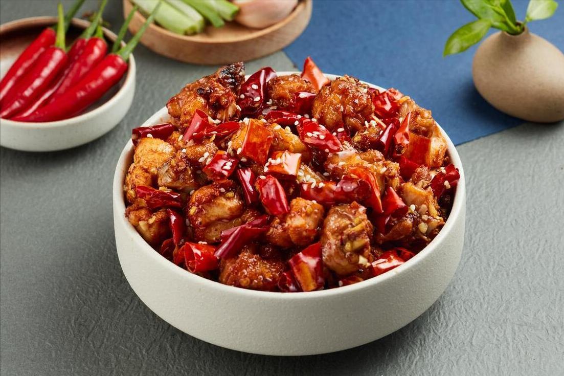 用到:雞肉、幹辣椒、花椒、大蒜、蔥花、鹽、白糖、味精、料酒、澱粉、生抽、白芝麻