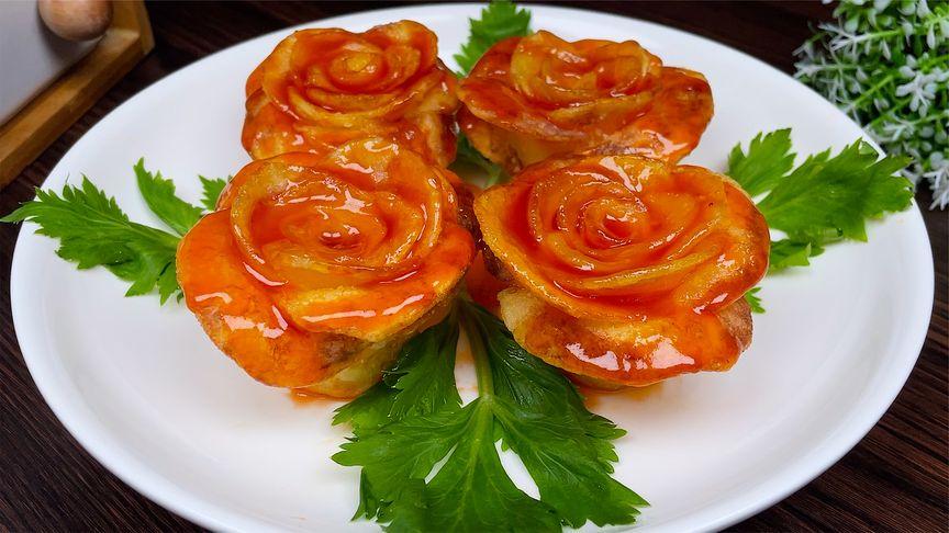 - 泡軟的土豆片裹一圈澱粉,一層一層捲起來,整理成玫瑰花瓣形狀,用牙籤固定。五成油溫時放入炸至金黃酥脆,控油撈出。
