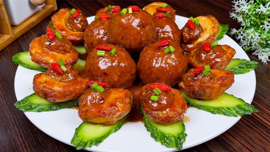 - 油熱後放入蛋黃肉球,用筷子翻動,再放入蛋清,控油撈出裝盤。準備半根蔥白、蒜片、薑片和大料。另起鍋倒油,油熱後放入蔥薑蒜炒香,加大料、適量清水、食鹽、雞精、十三香、白糖、生抽、老抽,攪勻煮開。倒入雞蛋和肉球,燜煮 8 分鐘,撈出擺盤。湯汁再次煮開,倒入澱粉水勾芡,攪拌至粘稠,淋在雞蛋和肉球上,放上枸杞和蔥花即可。