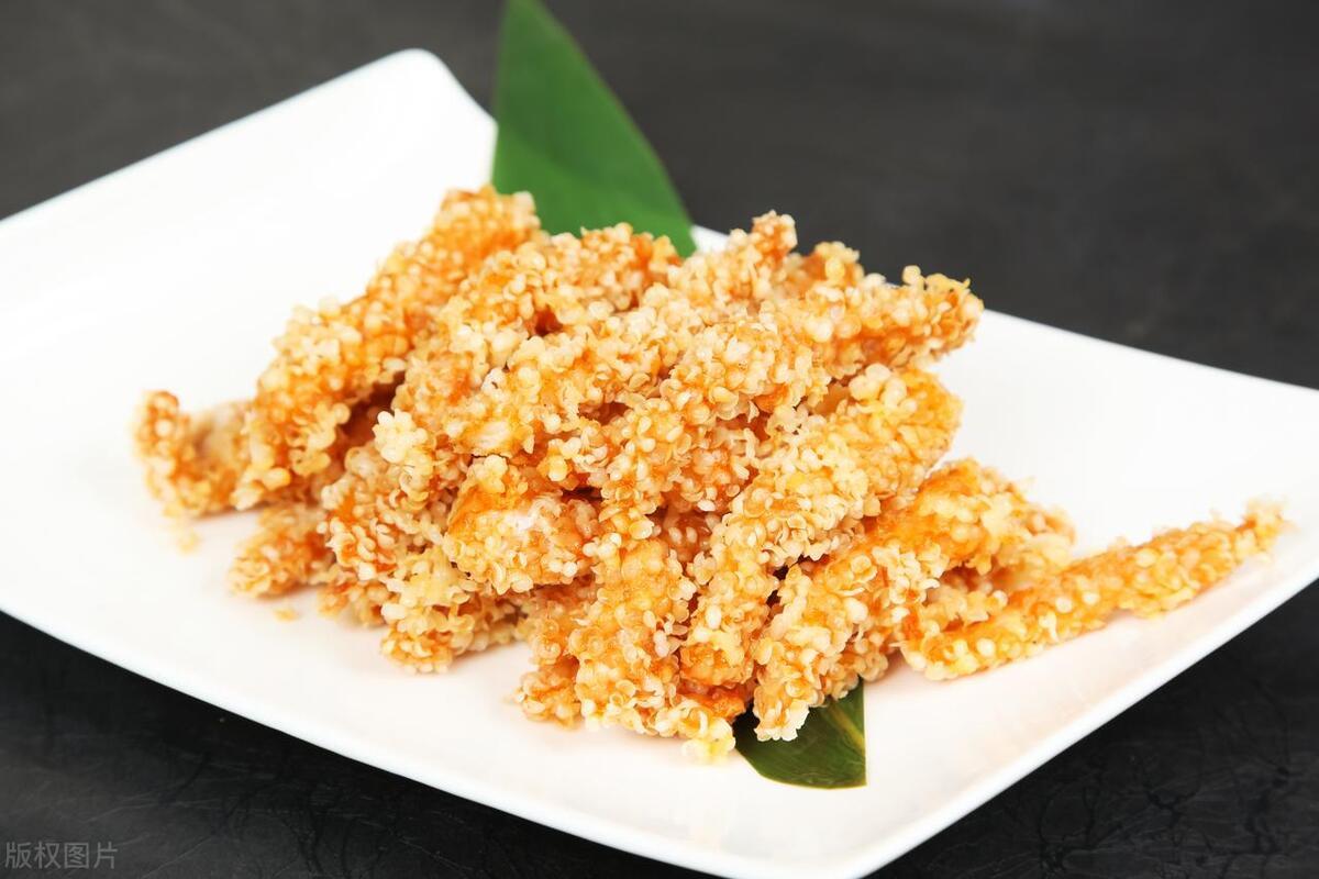 - 炸制:鍋中油溫六成熱,放入肉條炸至表面金黃,控油撈出。升高油溫,復炸 30 秒左右,撈出控油即可。