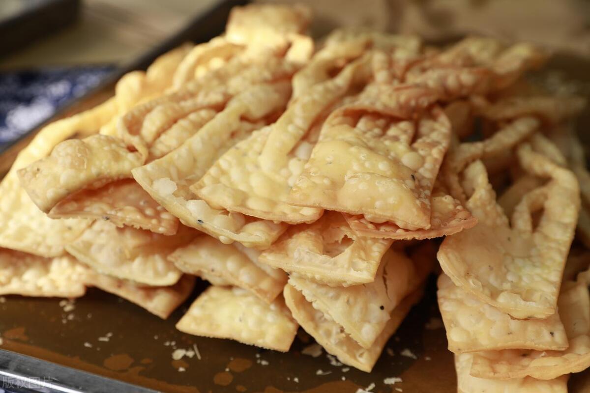 - 炸制:醒好的麪糰無需再揉,直接擀成薄片,切成菱形小塊。鍋中油溫五六成熱,下鍋炸至金黃色,控油出鍋。