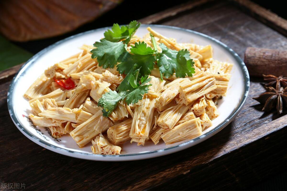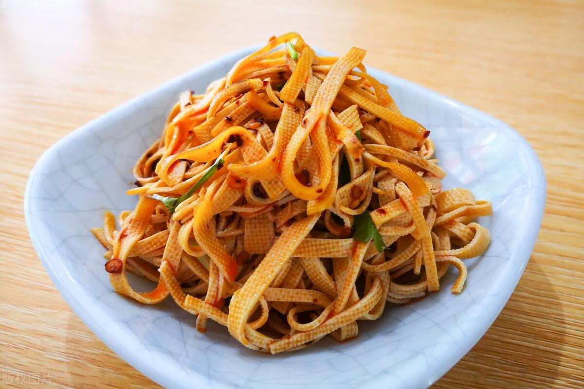 - 鍋中倒入適量清水,大火燒開後,加入 2 克食用鹼,輕輕攪拌,使其完全溶解。接着,將切好的豆腐皮絲緩緩放入鍋中,讓它們在水中盡情舒展,焯水 2 分鐘。這一步加入食用鹼,能讓豆腐皮變得潔白如玉、鮮嫩爽滑。時間一到,迅速撈出豆腐皮,放入準備好的涼白開中,讓其快速冷卻。待豆腐皮徹底放涼,用手輕輕擠幹其中的水分,確保口感的清爽。