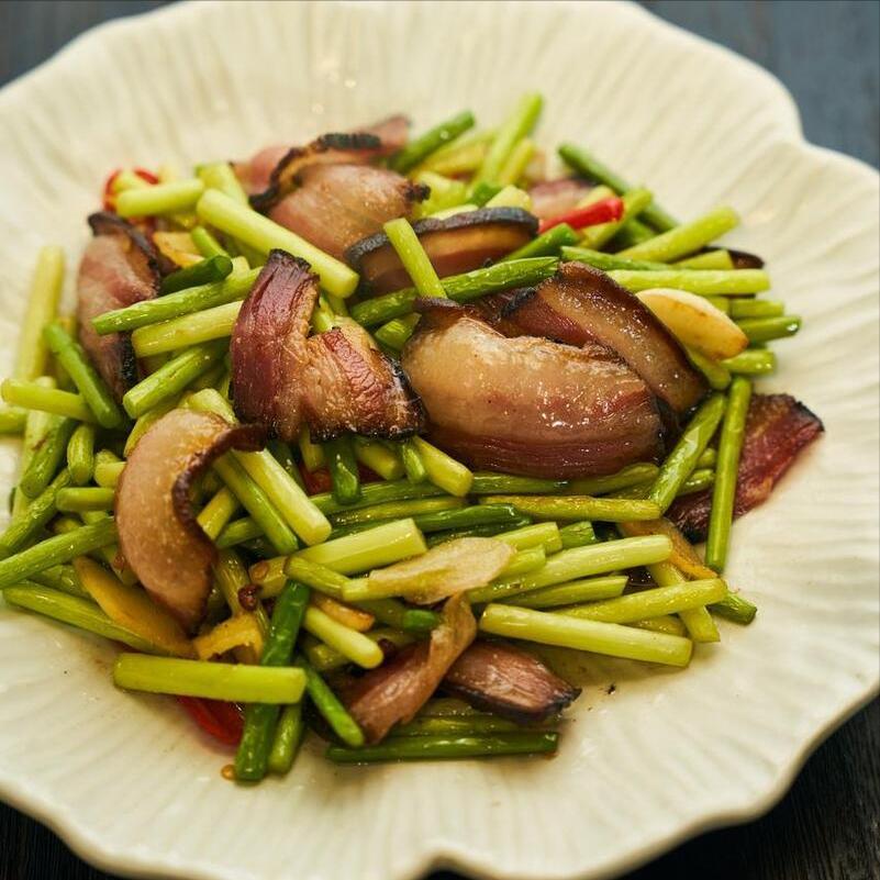 食材:新鮮蒜薹、臘肉、小米椒、生薑、鹽、味精、生抽、食用油