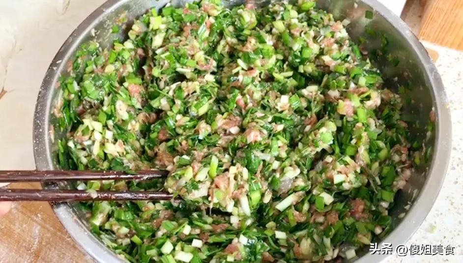 步驟:先把蝦仁洗淨,挑去蝦線,切成小段。然後放入碗中,加入一點料酒、胡椒粉、蔥姜醃製10分鐘。韭菜洗淨切碎,放入大碗中,加入適量香油拌勻,這樣可以防止韭菜出水。豬肉剁碎加鹽味精胡椒粉醬油醃製20分鐘入味,將蝦仁、豬肉、韭菜混合在一起,再加入鹽、生抽,攪拌均勻。