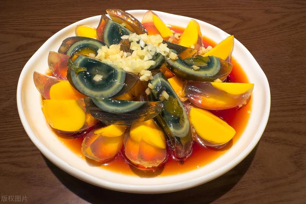 - 將青椒丁、紅椒丁、蒜末撒在皮蛋上,淋上調好的料汁,攪拌均勻即可。
