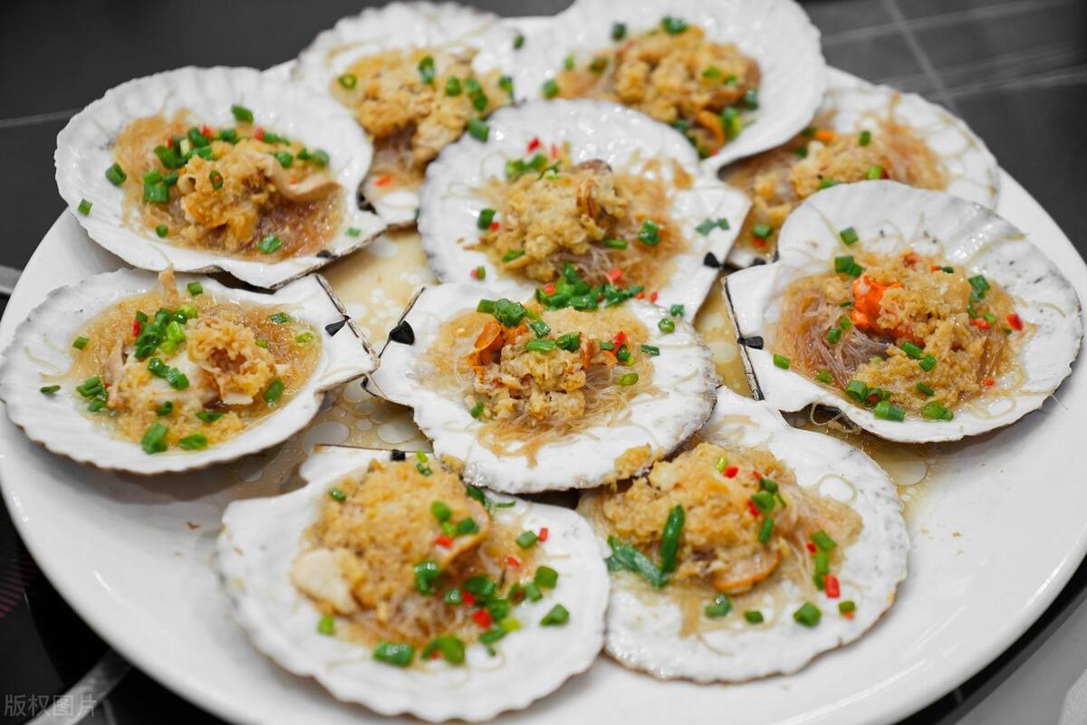 - 將泡軟的粉絲撈出,瀝乾水分,放在扇貝肉上,再將蒜蓉醬均勻地鋪在粉絲上。鍋中加水,大火燒開後放入扇貝,蒸 8 - 10 分鐘,取出後撒上蔥花,淋上熱油即可。